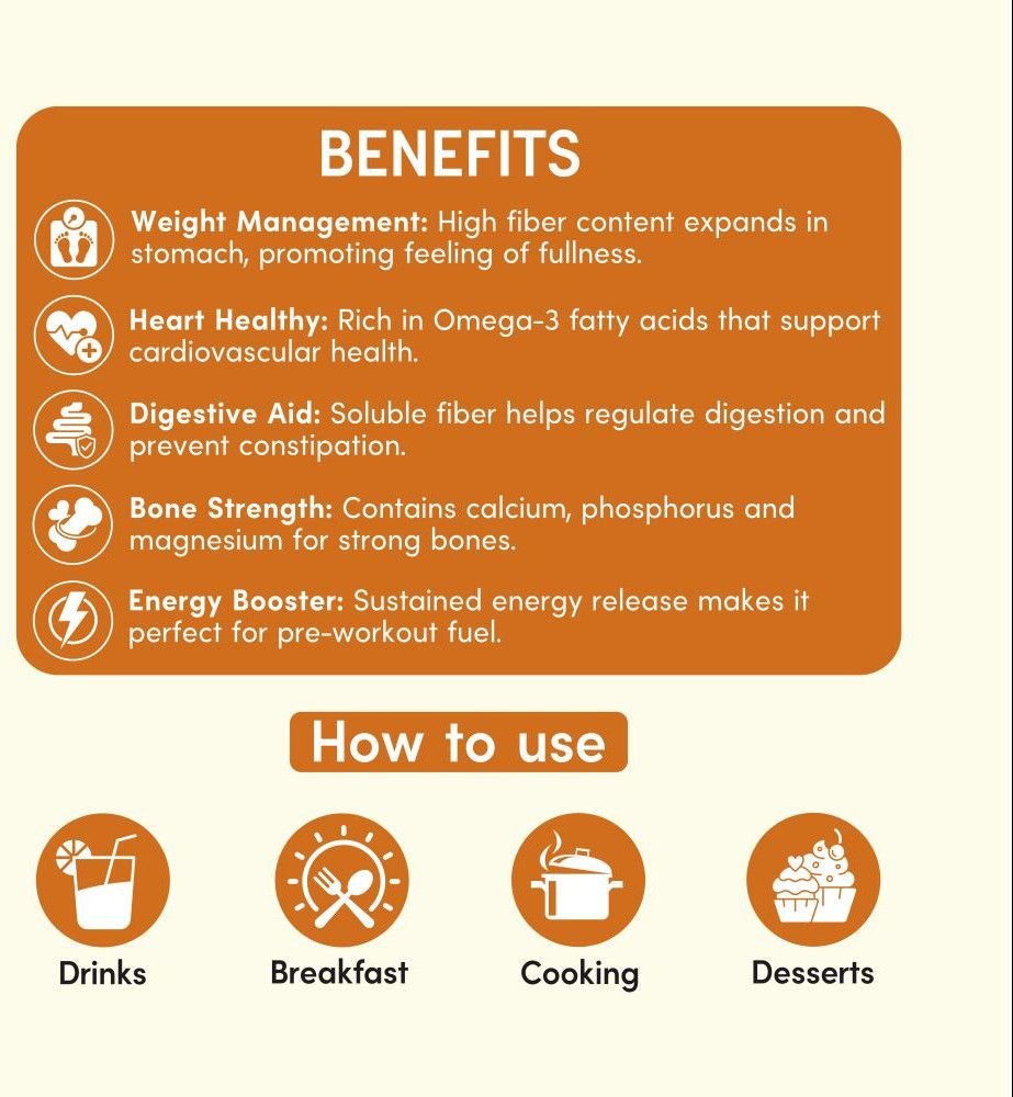 | Feature | Rich In Omega-3,Fiber & Protein,Calcium & Antioxidant Rich,Clean & Gluten-Free |