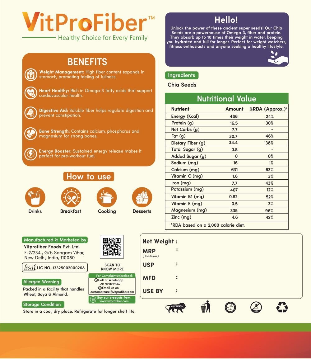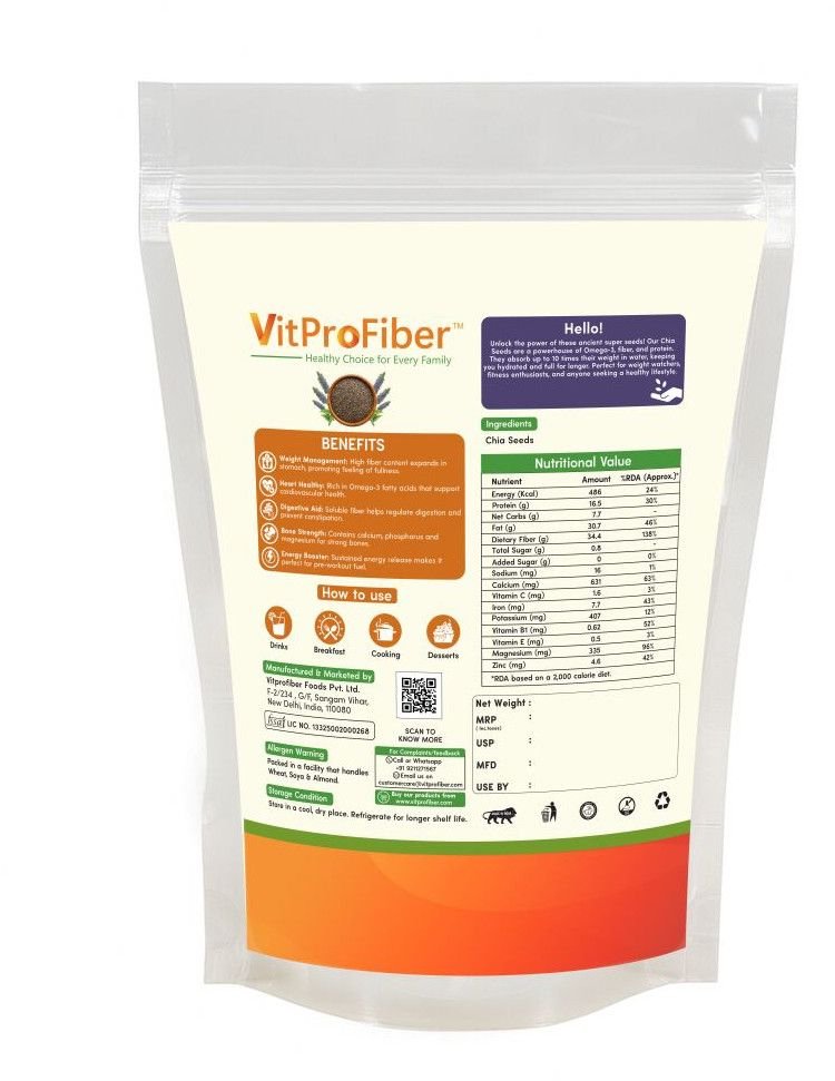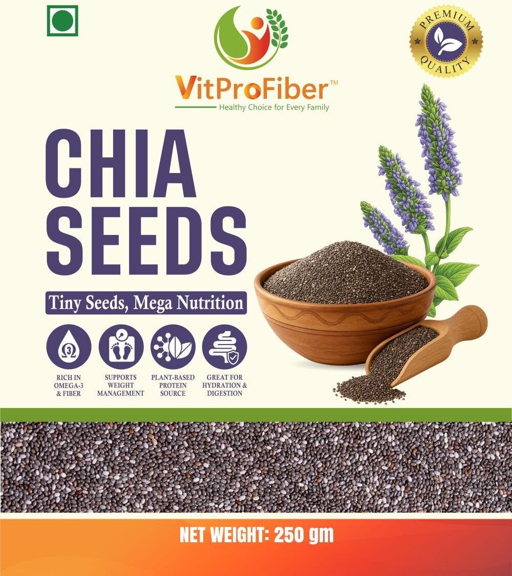Title: VitProFiber Chia Seeds 250 gm | Rich in Omega-3, Fiber & Protein | Superfood for Weight Loss, Hydration & Energy | Calcium & Antioxidant Rich | Seeds for Eating, Smoothies, Pudding & Baking | Clean & Gluten-Free
