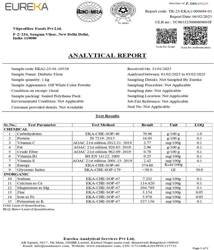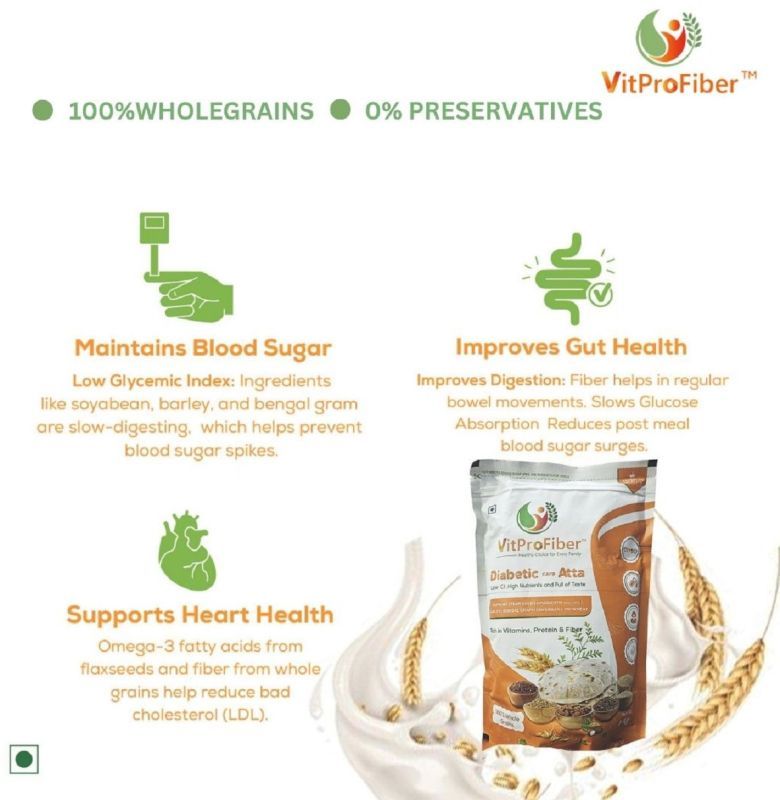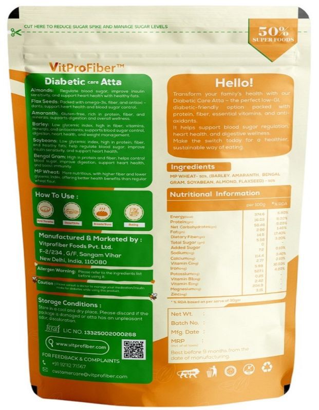 VitProFiber Diabetic Care Atta is a nutritious, diabetes-friendly flour designed for the whole family. With a Glycemic Index of less than 50, it supports balanced blood sugar levels and enhances metabolic health. This specially formulated blend contains 50% whole MP wheat and 50% superfoods such as almond, flaxseed, barley, amaranth, soybean, and Bengal gram.