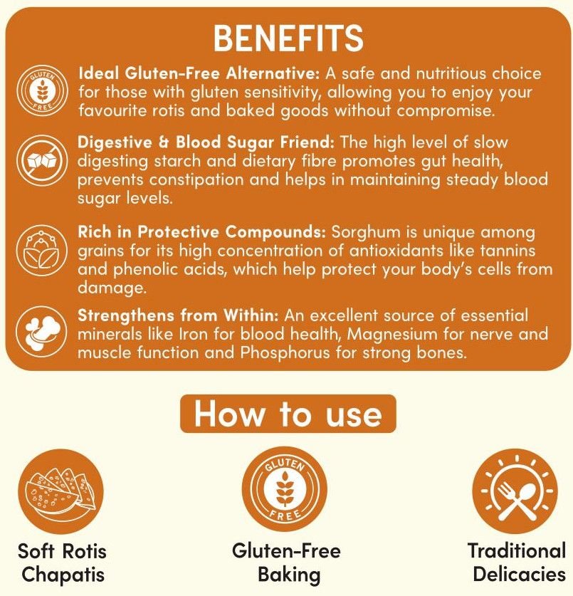 Rediscover the power of an ancient grain with our pure Sorghum (Jowar) Flour. A naturally gluten-free powerhouse, it's your perfect partner for creating healthier, everyday meals. With a mild, nutty flavour and a wealth of nutrients, it helps you bake and cook your way to balanced well-being.