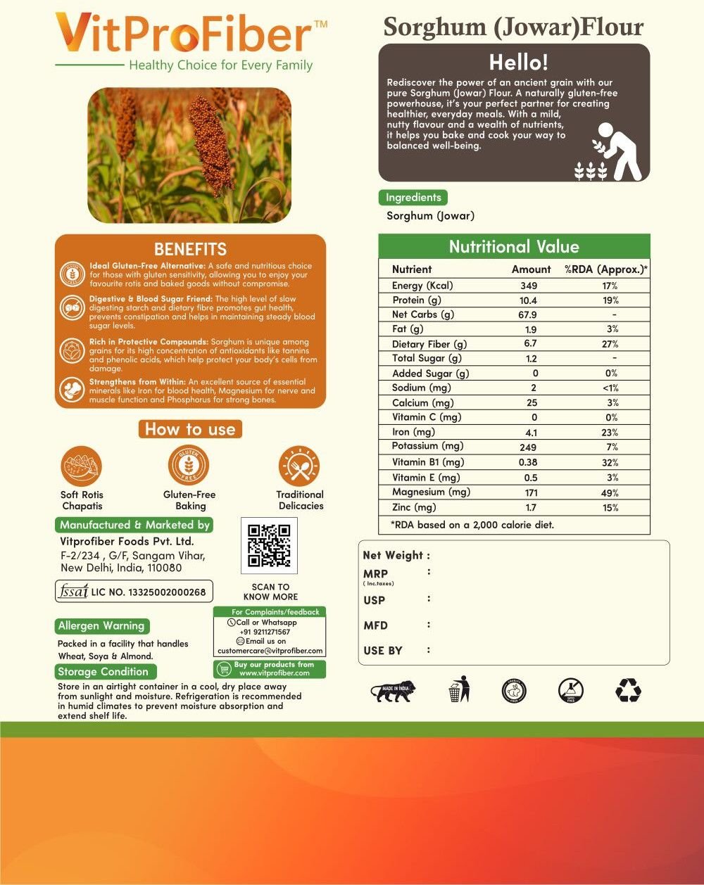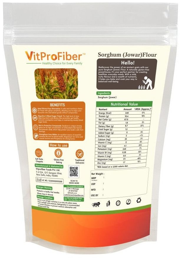Discover the wholesome goodness of Vitprofiber Jowar Atta, a premium gluten-free flour meticulously crafted from finest-quality sorghum to bring you authentic nutrition and taste. This nutrient-rich atta is packed with natural plant-based protein and dietary fiber, supporting muscle health, aiding digestion, and promoting lasting satiety—making it ideal for weight management. With its low glycemic index, it helps maintain stable blood sugar levels, while being completely gluten-free, perfect for those with dietary restrictions or anyone seeking a healthier alternative to wheat. Versatile and easy to use, our Jowar Atta is perfect for making soft rotis, delicious bhakris and a variety of baked goods. Embrace the traditional power of jowar for modern wellness and elevate your daily meals with the pure, unadulterated quality of Vitprofiber.